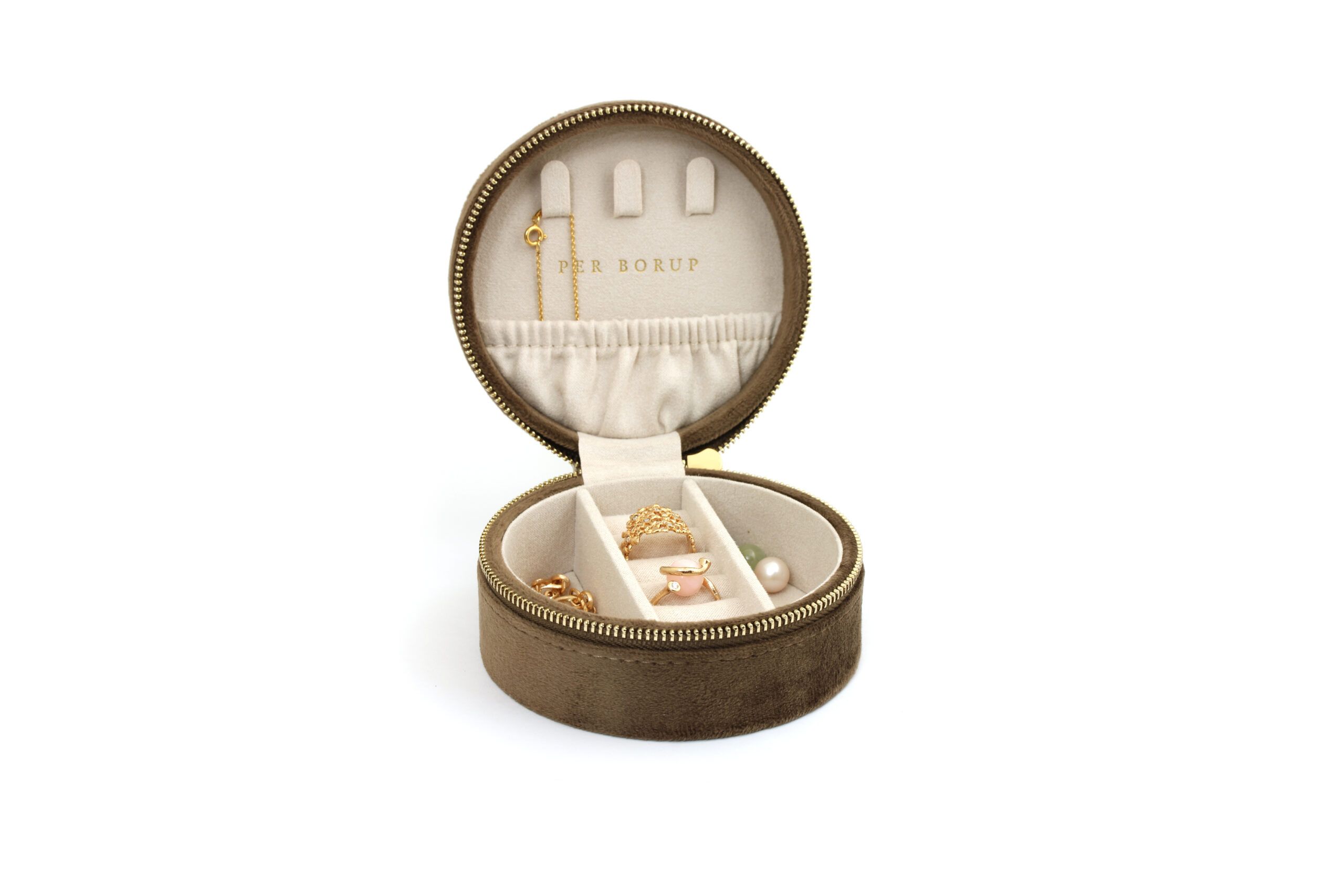 Elegant travel jewellery box in soft velvet, perfect for keeping your jewelry safe and organized on the go. The box has a full-length zipper, several small compartments for rings, earrings and pendants, as well as hooks and a pocket for chains. A beautiful and practical companion for your favorite jewellery – both at home and on the go.