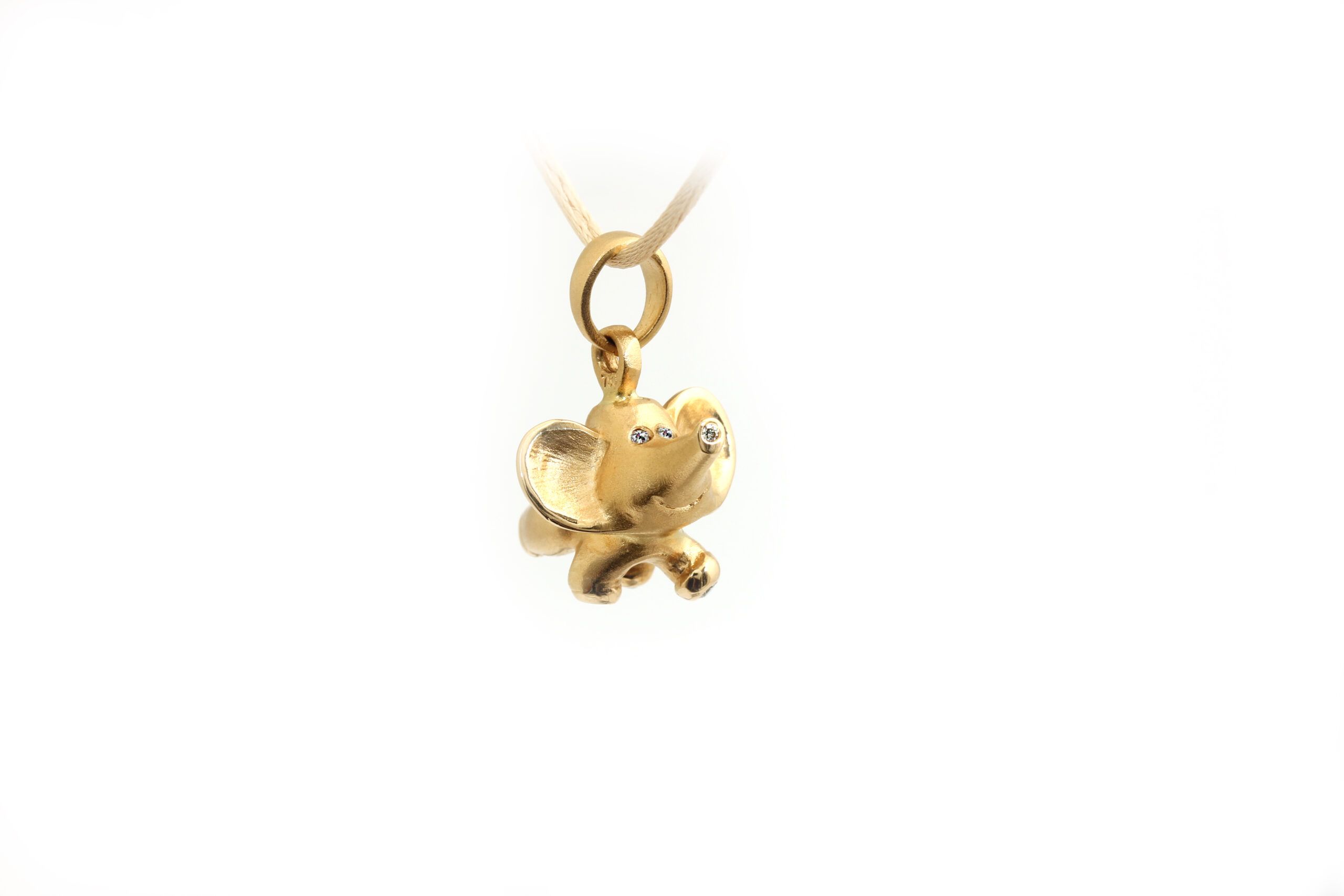 Et lille vedhæng med stor personlighed. Denne charmerende baby elefant er fuld af liv og detaljer – med funklende diamanter i både fødder, øjne og snabel. Formen er blød og legende, og udtrykket er umiddelbart – næsten som en lille lykkebringer. Håndlavet på vores værksted i København med varme og humor.