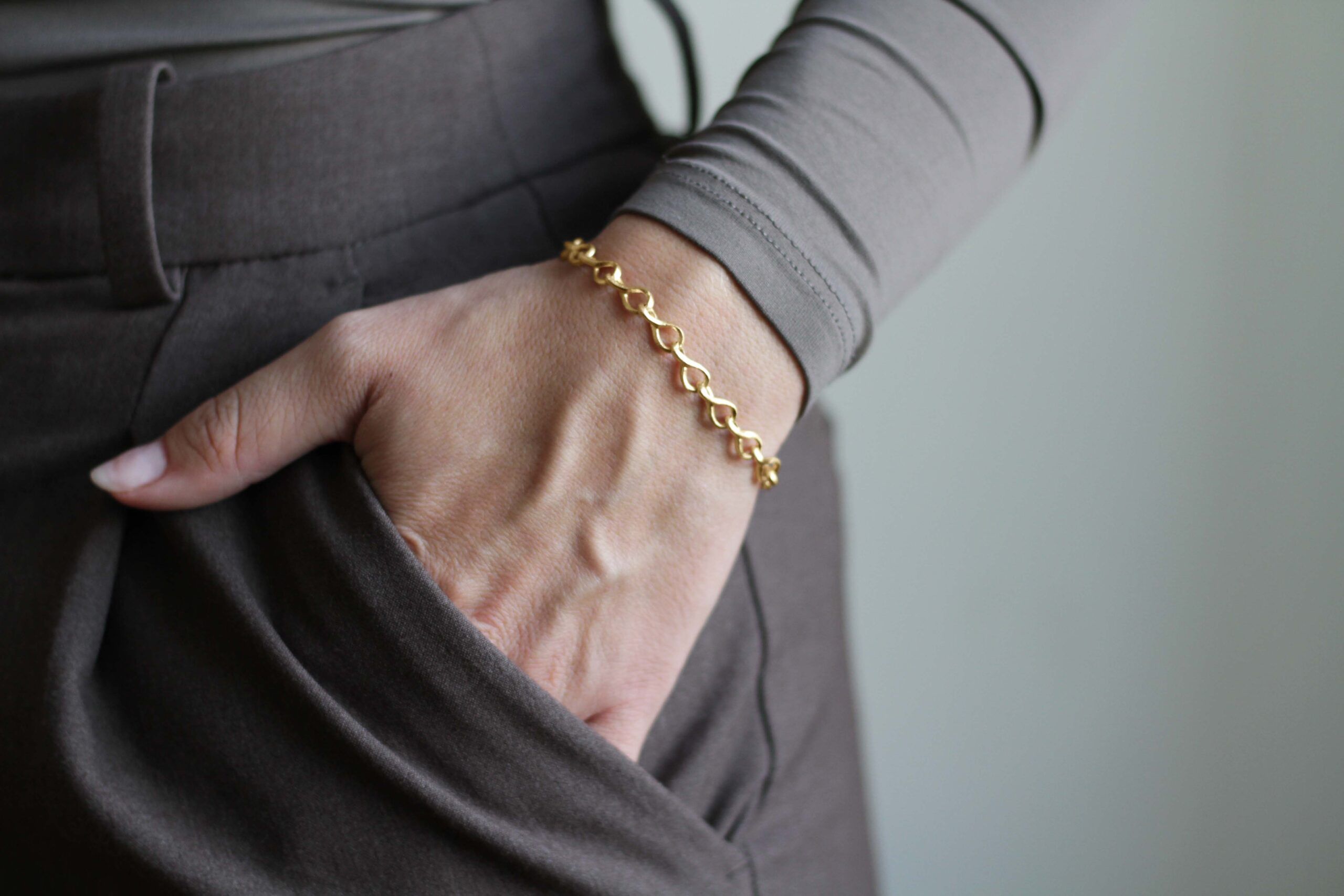 Calligraphy-armbåndet er skabt af organiske led, der slynger sig som små, håndskrevne strøg. Hvert led har sin egen rytme, og sammen danner de en kæde, der balancerer det enkle og det levende. Armbåndet fanger essensen af kalligrafiens linjer – let, personligt og fuld af bevægelse. Et stilrent smykke, der føles naturligt at bære, som en stille fortælling om skønhed i det enkle.